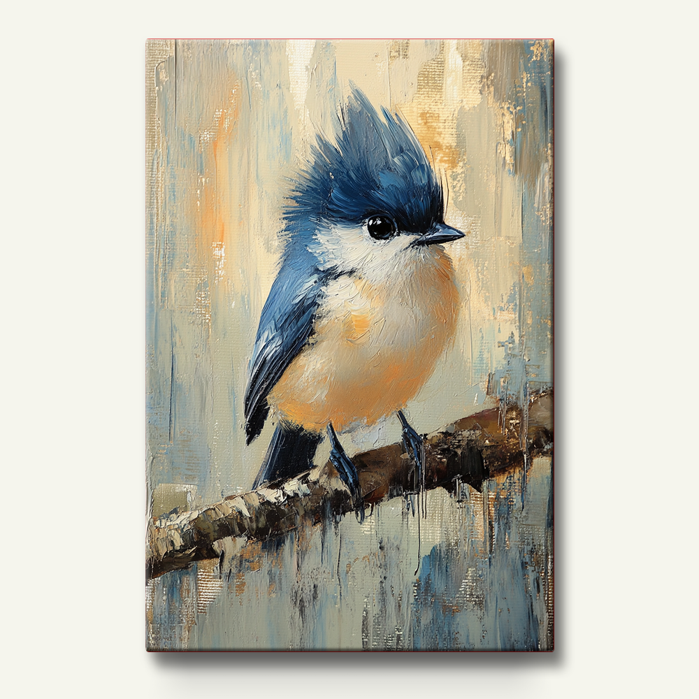 The tiny avian boasts a fluffy blue crest and wings, contrasted by a soft, warm blend of cream and orange-yellow feathers on its chest. Its round, black eyes sparkle with curiosity and liveliness, as if gazing into the distance. The artist’s impasto technique brings the texture of the feathers to life, each stroke imbued with power and vitality. The gnarled branch is depicted with rugged strength, offering a lovely contrast to the bird’s delicate form. The background, rendered in abstract, free-flowing strokes, merges soft yellows, pale blues, and off-whites, creating the gentle ambiance of a serene morning or evening light. It’s subtle yet provides a profound depth to the scene. The entire piece exudes warmth and tranquility, a perfect fusion of nature and art that invites contemplation and appreciation for the quiet beauty of the natural world.