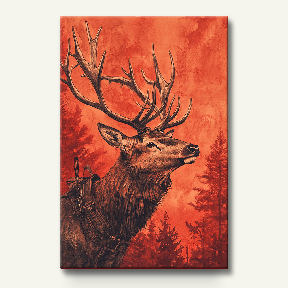 A majestic deer stands in front of a reddish-brown forest backdrop. Its antlers stretch out like branches, symbolizing the flourishing vitality and the solemnity of nature. The deer’s eyes were deep and calm, as if it were guarding this ancient forest.