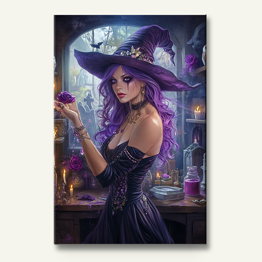 A mysterious witch stands before an ancient window, her violet tresses echoing the hue of her wizard’s cape, creating an aura of both enigma and elegance. She cradles a violet rose in her hand, as if murmuring an ancient incantation. Flickering candlelight dances around her, illuminating her deep, piercing gaze and exquisite jewellery, immersing the entire scene in magic and fantasy.