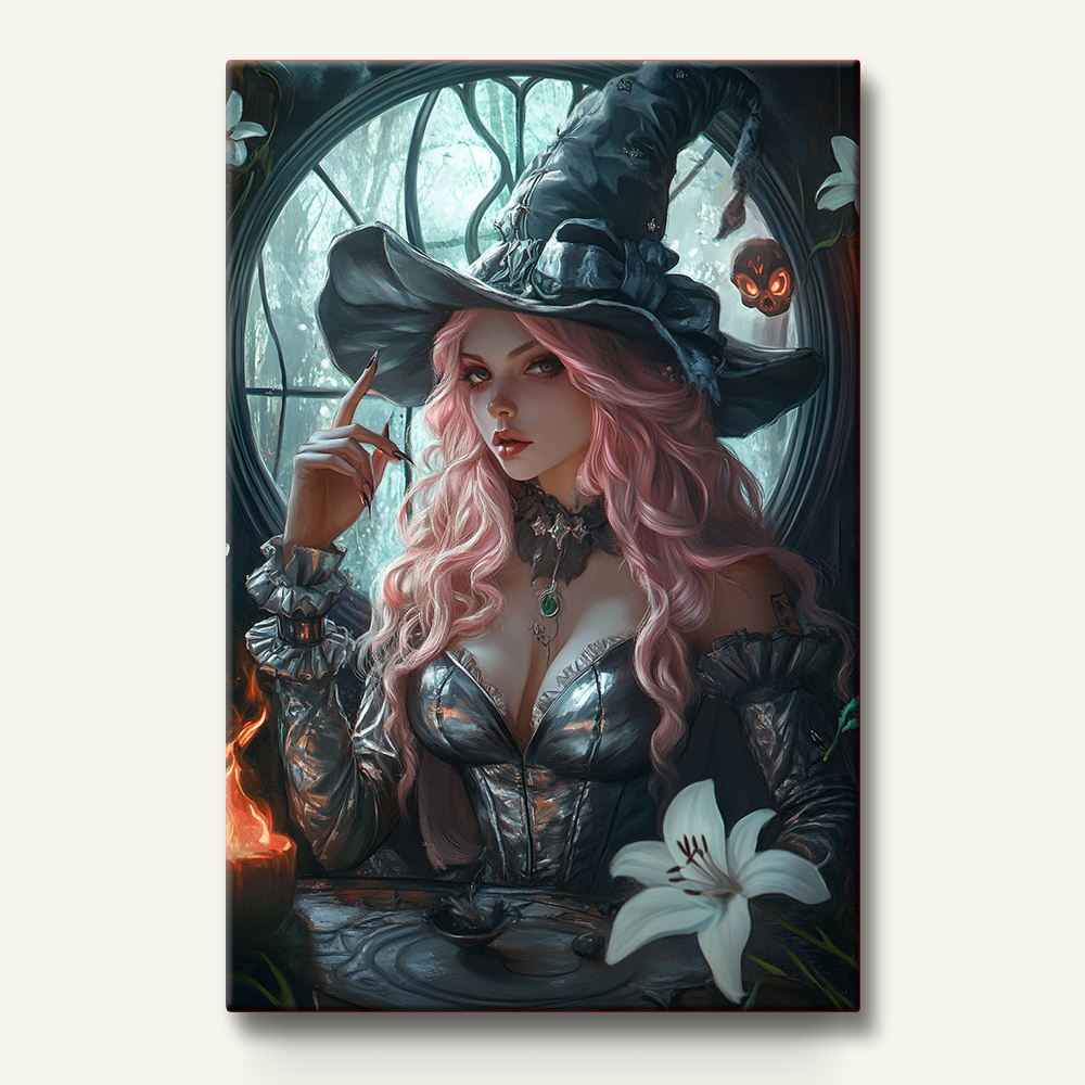 From her cascading pink locks to her storybook pointed cap, through to the black corset and sparkling gemstone necklace, every element is precisely numbered, awaiting your brush to bring it to life. The mysterious forest beyond the Gothic rose window in the background, the flickering candlelight upon the table, and the delicate lilies—all will come to life under your brush. No artistic background is required; simply colour by number to effortlessly recreate this masterpiece steeped in dark aesthetics. Immerse yourself in the joy of creation, experiencing firsthand the wondrous fusion of colour and light. Ultimately, you’ll complete a piece that serves not only as decoration but as a unique expression of your personal artistry. Let this “Phantom Whispers: The Midnight Sanctuary of the Pink-Haired Witch” illuminate your space, becoming a symbol of your distinctive taste.